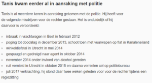 Citaat artikel RTV-Utrecht: Voor de verkrachtingszaak heeft Tanis in 2017 een maand vastgezeten. Hij mocht zijn rechtszaak daarna in vrijheid afwachten op voorwaarde dat hij mee zou werken aan een persoonlijkheidsonderzoek en aan een rapport van de reclassering. Toen een jaar later bleek dat hij zich daar niet aan hield, werd hij in januari van dit jaar opnieuw opgesloten. Maar Tanis ging daartegen in hoger beroep. Hij beloofde het gerechtshof dat hij nu wel zou meewerken aan het onderzoek en het reclasseringsrapport. Sinds 1 maart is hij daarom opnieuw op vrije voeten.