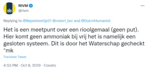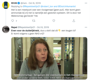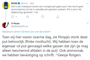Het meetpunt naast de rioolput komt in bovenstaande verklaring trouwens niet eens voor, maar kwam toch ineens aan de orde in de twitterconversatie. De twitteraar van het RIVM kwam met de stellige bewering dat er bij de rioolput helemaal geen ammoniak vrijkwam… sterker nog: dit was met het Waterschap besproken.