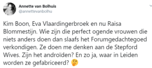 Als u denkt dat ik deze bagger verzin: al dit fraais was te vinden in reacties onder deze (inmiddels verwijderde) tweet van ene Annette van Bolhuis.