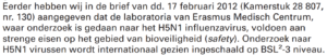 Dan de volgende vraag: Hoe veilig was het Rotterdamse lab? Het beveiligingsniveau van het onderzoek in Rotterdam werd beschreven in een volgende brief aan de Tweede Kamer op 7 maart 2012, wederom van de hand van Edith Schippers: