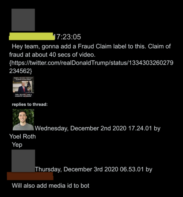 Examining the entire election enforcement Slack, we didn’t see one reference to moderation requests from the Trump campaign, the Trump White House, or Republicans generally. We looked. They may exist: we were told they do. However, they were absent here.