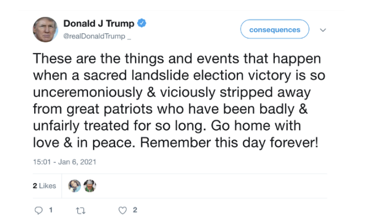 Hier is de e-mail van Vijaya: Hallo team, een update over acties die we ondernemen naar aanleiding van wat er in DC gebeurt vandaag. We hebben 3 tweets verwijderd (bounced) van @reaIDonaIdTrump op 6 januari 2020 voor het maken ongegronde claims over kiezersfraude en verkiezingsdiefstal, welke moeten worden gezien in de context van het geweld in Washington DC vandaag en redelijkerwijs kunnen worden verwacht te blijven aanzetten tot gewelddadige acties in het hele land. We hebben een time-out van 12 uur nodig na het verwijderen van deze tweets. We hebben dit ook getweet zodat onze acties transparant zijn en duidelijk is dat toekomstige schendingen van de Twitter-regels leiden tot permanente schorsing.