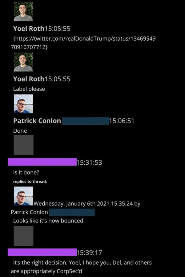 Minutes later, Roth executed the historic act of “bouncing” Trump, i.e. putting him in timeout. “I hope you… are appropriately CorpSec’d,” says a colleague: