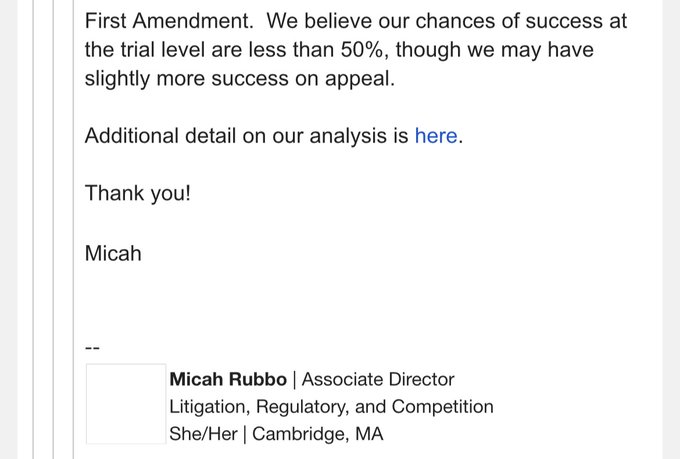 Eerste amendement. We denken dat onze kans op succes in de rechtszaak minder dan 50% is, hoewel we misschien iets meer succes hebben in hoger beroep.