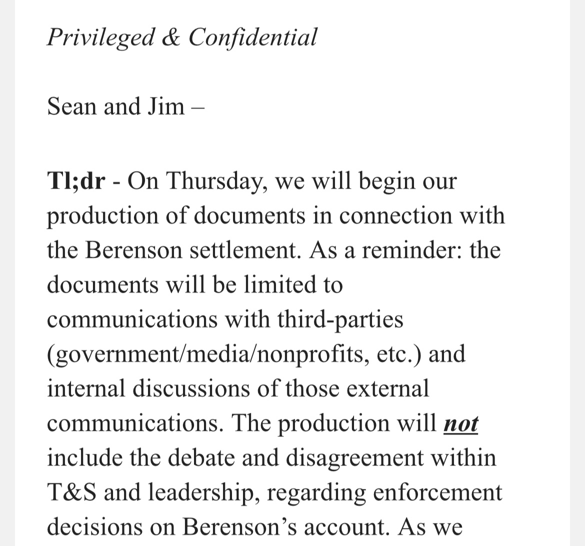 Tl;dr – Donderdag beginnen we met het leveren van documenten in verband met de Berenson-schikking. Ter herinnering: de documenten zijn beperkt tot communicatie met derden (overheid/media/non-profitorganisaties, enz.) en interne besprekingen van die externe communicatie. De levering zal geen betrekking hebben op het debat en de onenigheid binnen T&S en de leiding over handhavingsbesluiten op het account van Berenson. Zoals wij …