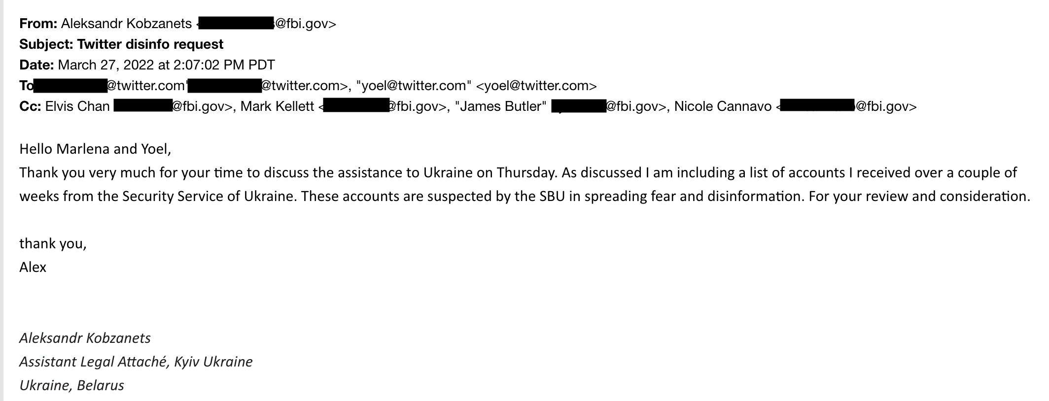 In March 2022, an FBI Special Agent sent Twitter a list of accounts on behalf of the SBU, Ukraine’s main intelligence agency. The accounts, the FBI wrote, “are suspected by the SBU in spreading fear and disinformation.”